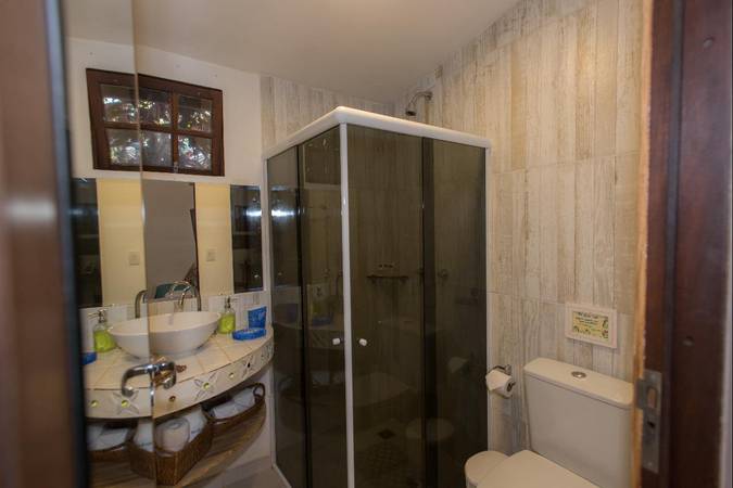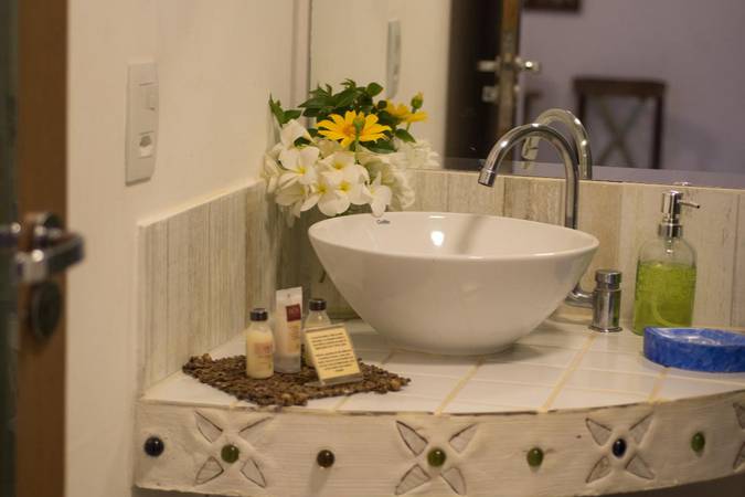 Esse quarto tem varanda privativa com frente para o jardim interno com redário, além de TV LCD 40" com canais a cabo, base de som, banho com aquecimento solar e sistema economizador de energia.